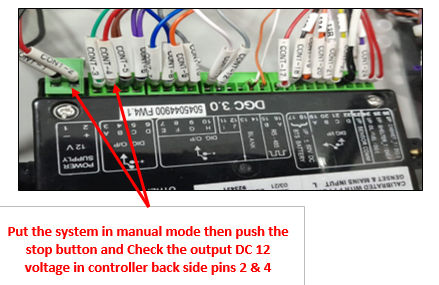 Put the system in manual mode then push the stop button and check the output DC 12 voltage in controller back side pins 2 & 4 :- 12V DC received