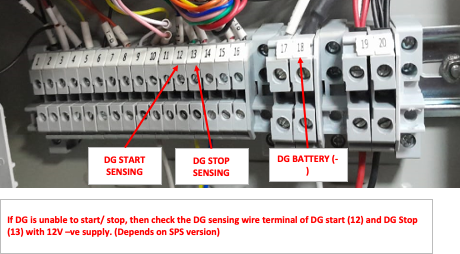 start (12) and DG Stop (13) with 12V –ve supply. DG should be start/ stop. (Depends on SPS version)