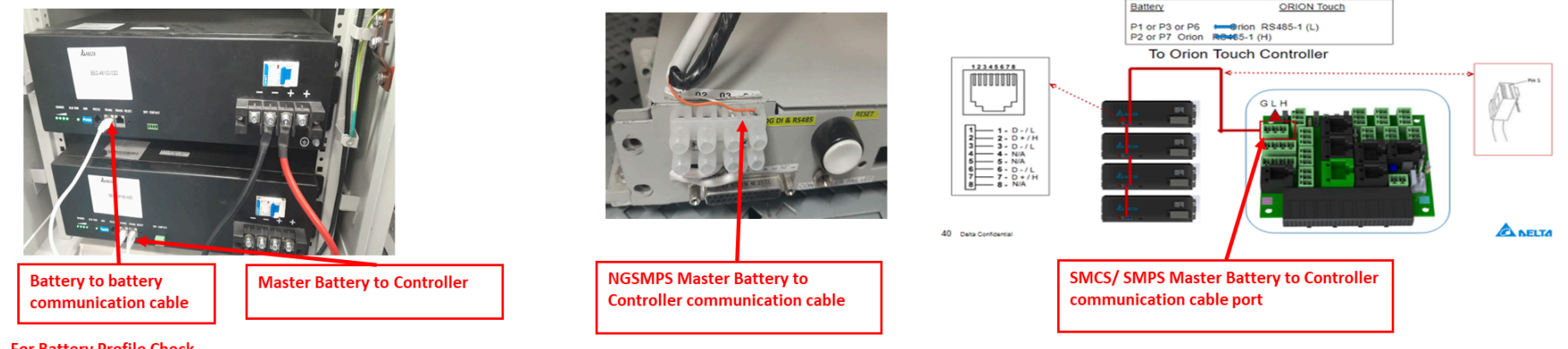Verify the battery communication cable connection. Ensure the master communication cable is properly connected between the battery and the SMPS RS485 port. The communication cable voltage should be between 2V and 5V.