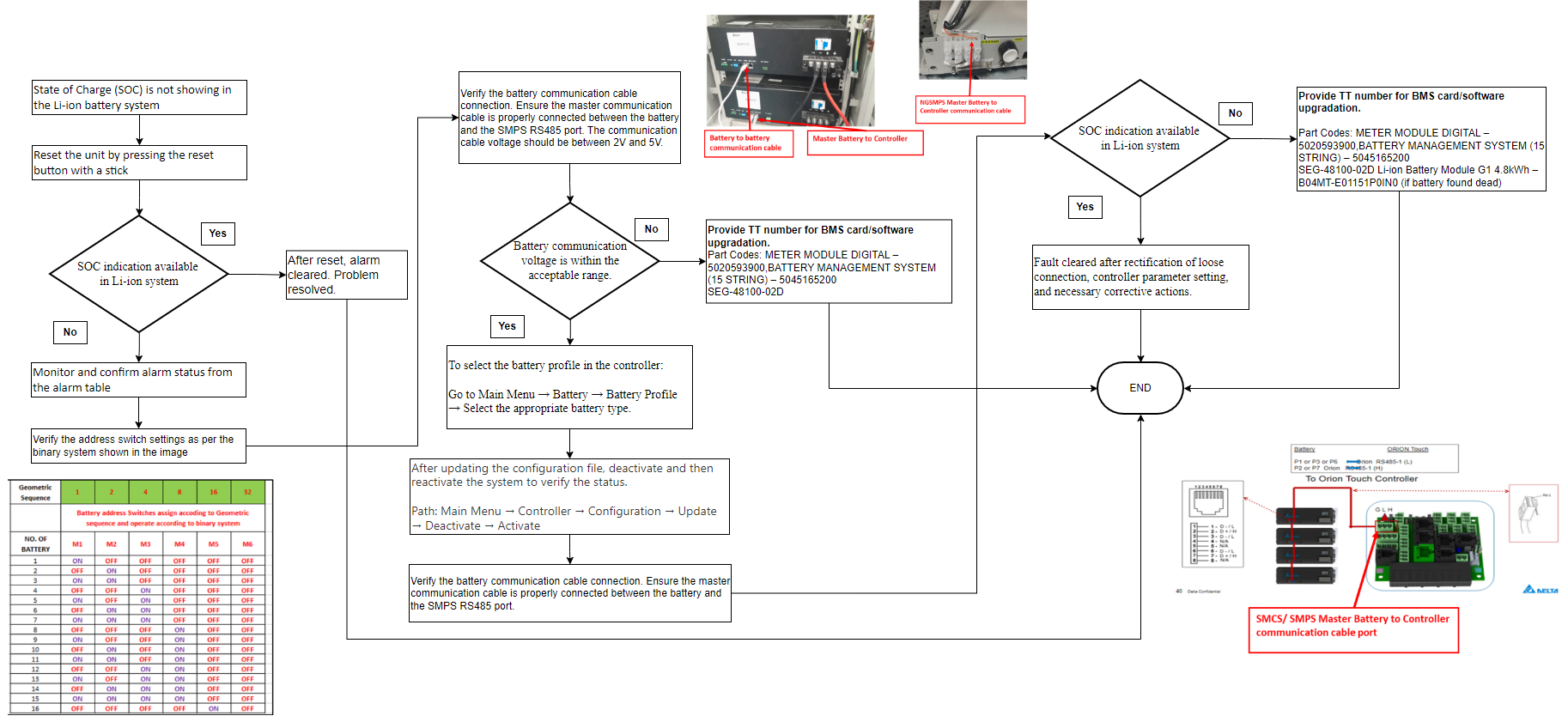 Verify the battery communication cable connection. Ensure the master communication cable is properly connected between the battery and the SMPS RS485 port.